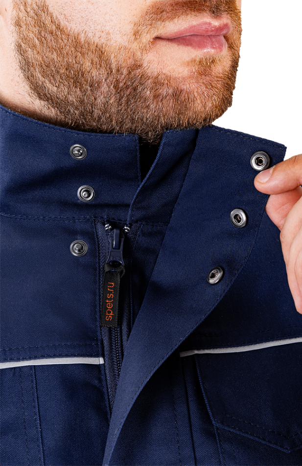 • центральная застежка на молнию с ветрозащитным клапаном на потайных кнопках. Ветрозащитный клапан исключает контакт молнии с оборудованием.