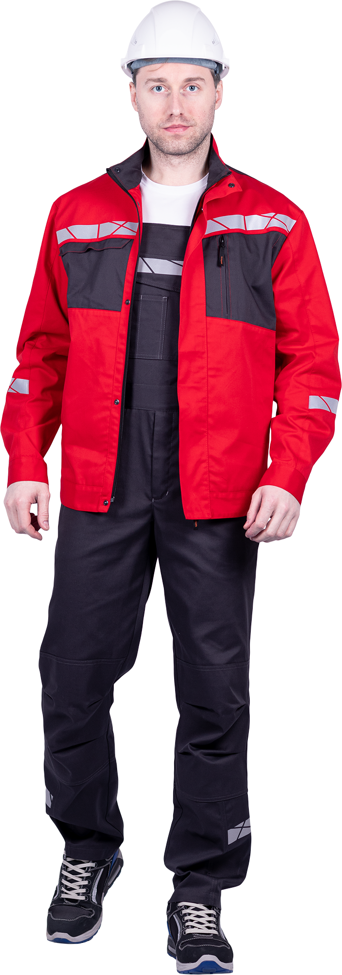 • горизонтальная термоклеевая световозвращающая полоса шириной 30 мм располагается по клапану нагрудного кармана, вверху спинки, низу брюк в области боковых швов.