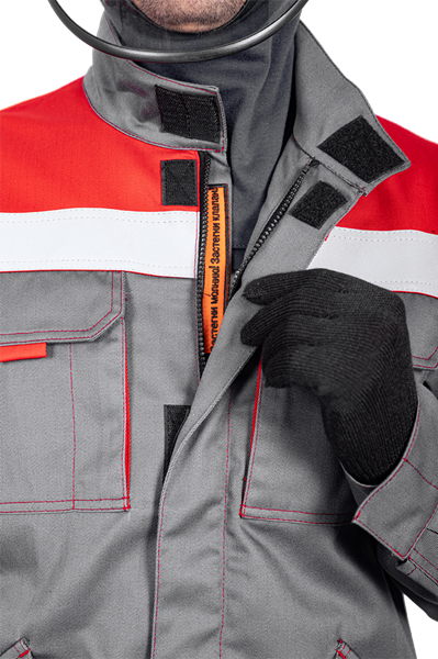 Уровень защиты: 3 То -(А1 и А2) от кратковременного воздействия открытого пламени Тт (уровень защиты В1) – защита от повышенных температур, от конвективной теплоты Ти (уровень защиты С1) – защита от повышенных температур, от теплового излучения Эс - от статического электричества Ми – защита от механических воздействий, истирания З – защита от общих производственных загрязнений Материал: огнезащитная ткань WORKER 265E Состав: 87% хлопок / 12% нейлон / 1% антистатическая нить, плотность 265±5% г/м2 Комплектность: куртка, брюки. Куртка прямого силуэта, с центральной бортовой застежкой-молнией, с цельнокроеной планкой с застежкой текстильной. Воротник - стойка. Ветрозащитная (внутренняя) планка имеет шевроном с напоминающей информацией «Застегни молнию! Застегни клапан!» Полочка с верхним и нижним накладными карманами с клапаном с застежкой. Правый верхний накладной карман имеет дополнительное отделение. По шву притачивания кокетки спинки и полочки ра