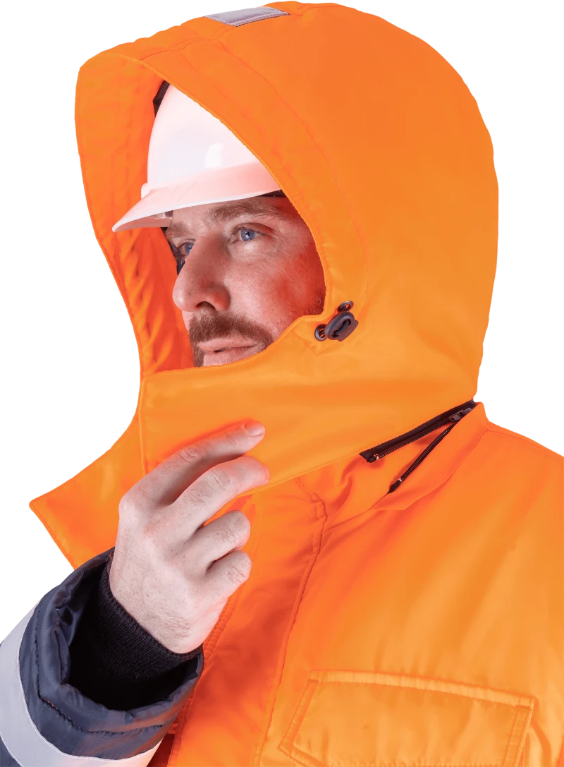 • капюшон утепленный с подбородочной частью, пристегивается на тесьму-молнию, с регулировкой
