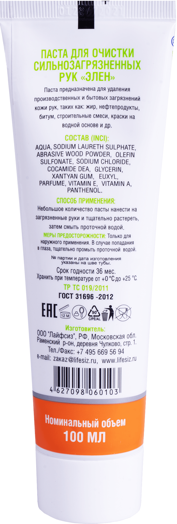 Очищающая паста "Элен" не содержит в своем составе острых и твердых абразивных гранул и имеет приятный свежий аромат. Средство для очистки рук от сильных загрязнений полностью распадается естественным путем и не вызывает раздражение на коже.