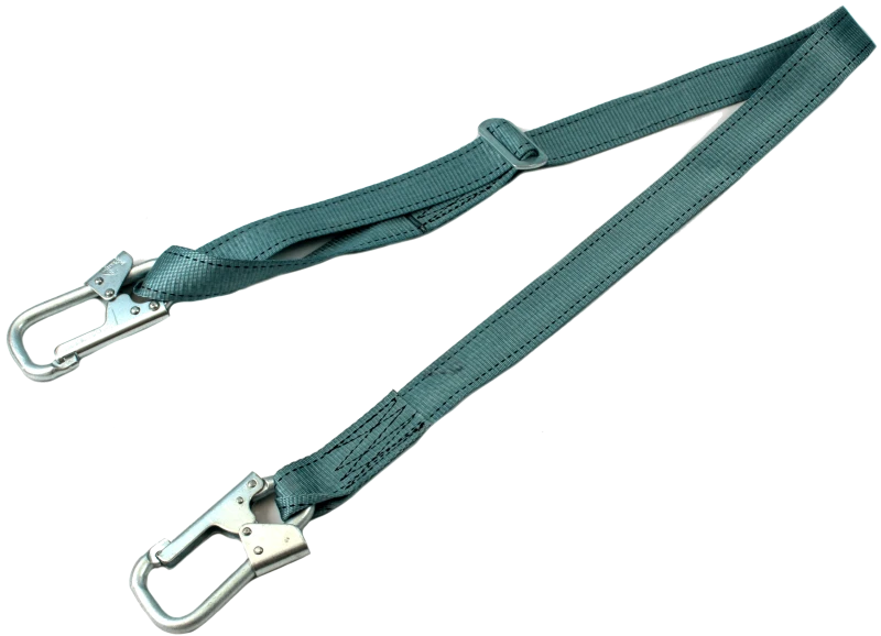 Строп ленточный регулируемый с двумя карабинами , используется как средство индивидуальной защиты от падения с высоты, может применяться как отдельная соединительная деталь, узел или компонент в системе с привязями и с анкерной точкой., дополнительно снабжён регулируемой пряжкой, позволяющей удлинить или укоротить строп,