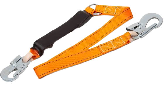 Строп ленточный с амортизаторои и двумя карабинами используется как средство индивидуальной защиты от падения с высоты, может применяться как отдельная соединительная деталь, узел или компонент в системе с привязями и с анкерной точкой.
